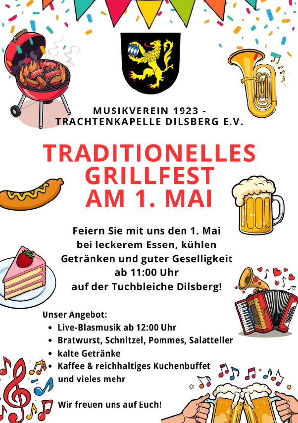 Der Musikverein 1923 – Trachtenkapelle Dilsberg lädt am 1. Mai ab 11 Uhr herzlich zu seinem traditionellen Grillfest auf der Tuchbleiche ein. Freunde der Blasmusik, Wanderer aus nah und fern und alle anderen Gäste dürfen sich auf kühle Getränke, leckere Speisen, Kaffee sowie ein reichhaltiges Kuchenbuffet freuen. Ab 12 Uhr sorgt Live-Blasmusik für die passende Stimmung.