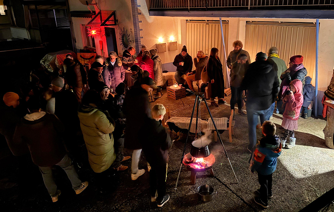 Am darauffolgenden Sonntag öffnete ein Hof im Dilsbergerhof seine Türen. Die Familien Erles und Rieth hatten alles stimmungsvoll beleuchtet und luden zu Glühwein, Punsch und frisch gebackenen Waffeln ein – ein gemütlicher Abend für Groß und Klein.