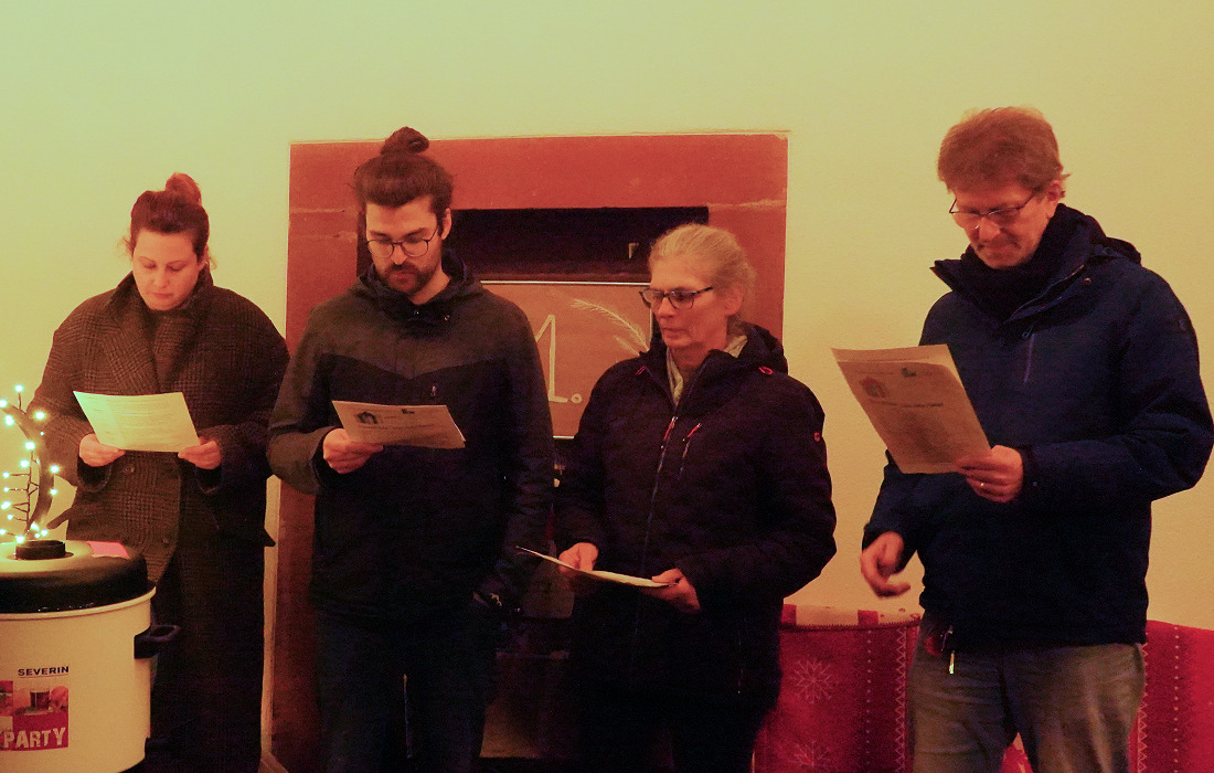 Das elfte Adventsfenster gestaltete Tanja Emmerich und Sebastian Haaf. Zusammen mit den Bammentaler Freunden Thomas und Petra Ochs präsentierte sie eine kleine Geschichte, bevor alle vor dem Haus zu einem gemütlichen Beisammensein zusammenkamen.