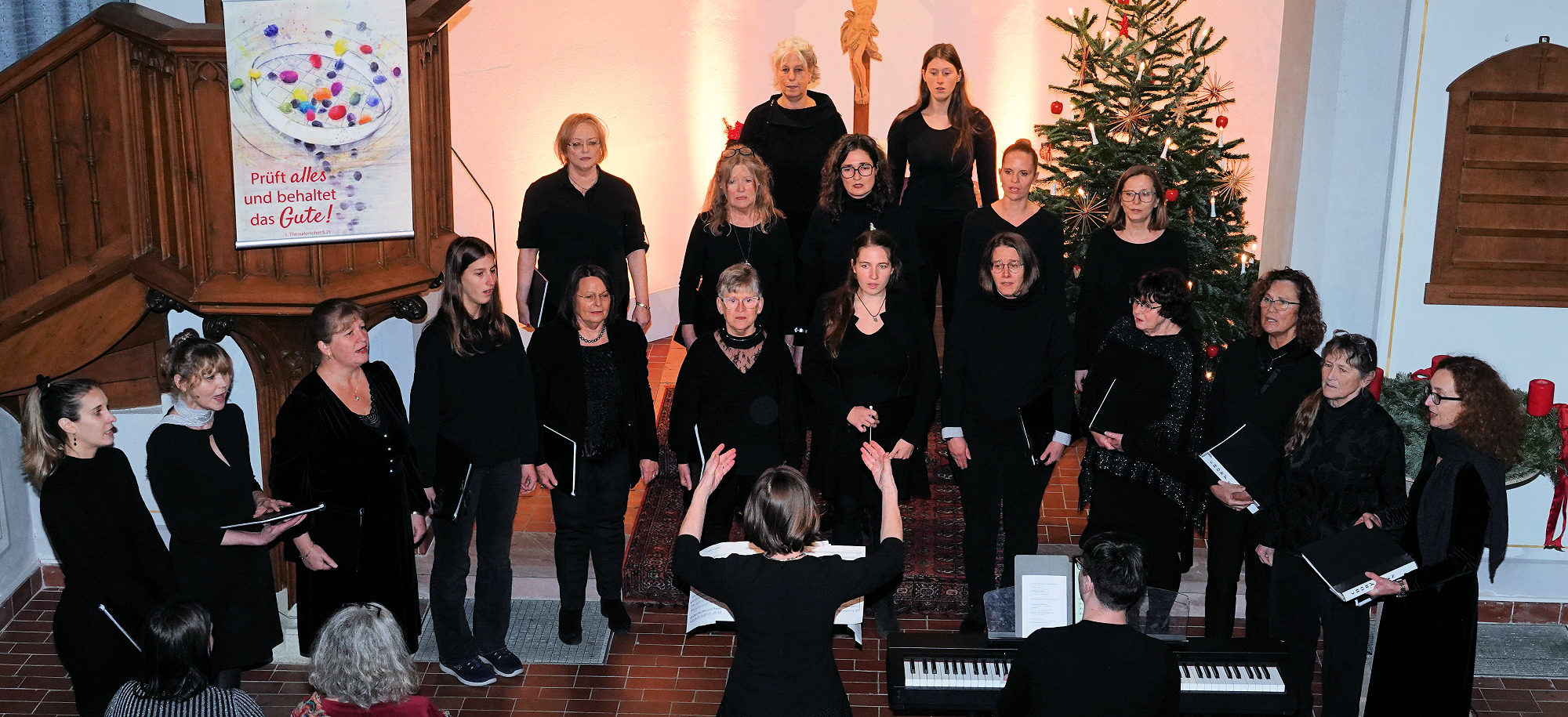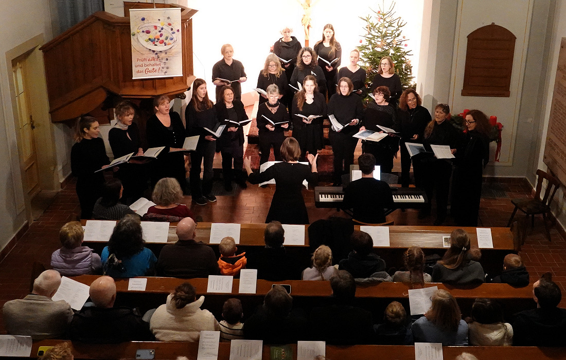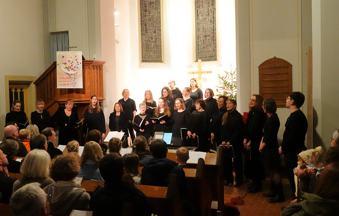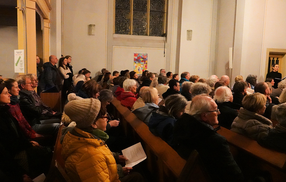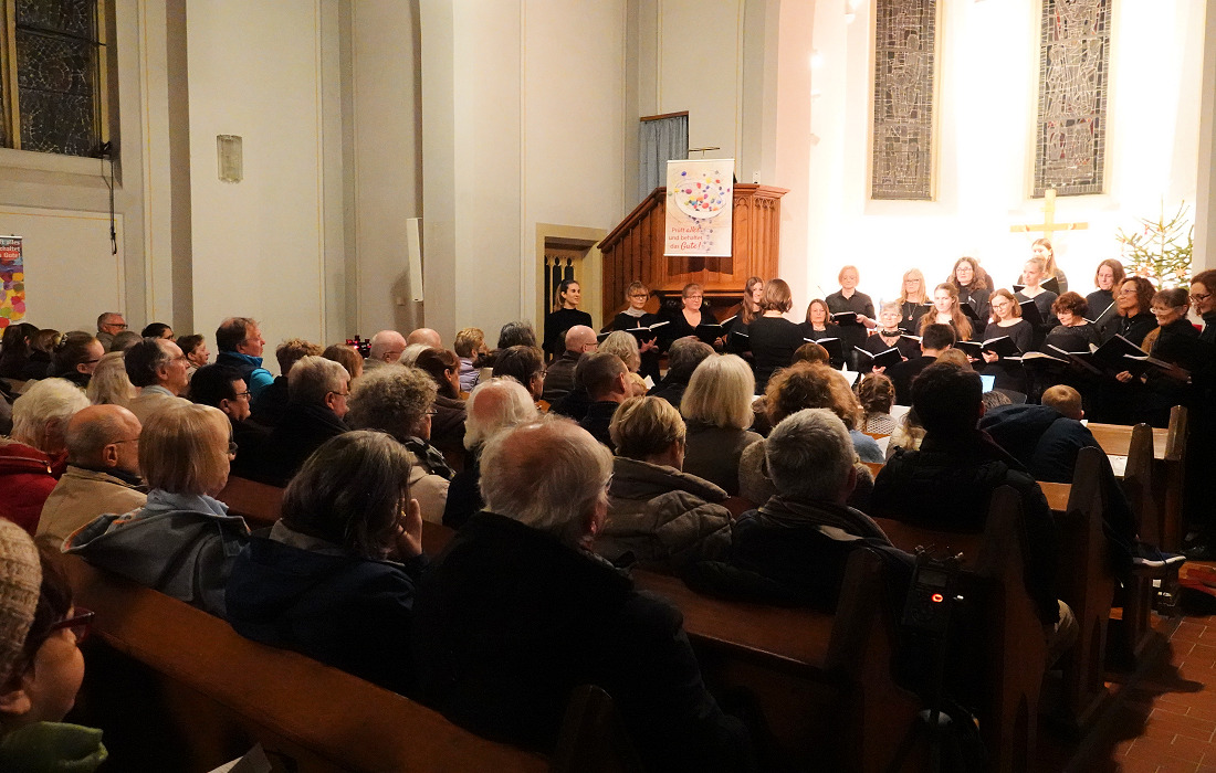 Eine voll besetzte Kirche, klare Stimmen und ein festlicher Chorklang machten das Konzert zu einem besonderen Erlebnis. Eine Mischung aus meditativen Momenten, musikalischen Höhepunkten und gemeinsamem Singen erzeugte eine intensive, herzliche Stimmung im ganzen Kirchenraum.