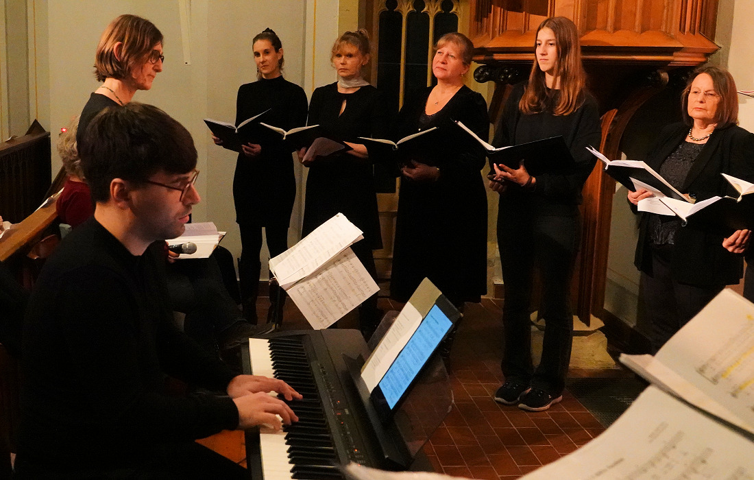 Claudia Rittmüller las die Übersetzungen von „Jul, jul“ und „In the bleak midwinter“ vor, deren Botschaften der Frauenchor greifbar greifbar machte. Am Klavier begleitete der Rohrbacher Musiker Till Otto den Chor aufmerksam und einfühlsam. Sein Spiel wob die Stücke aneinander, stützte die Sängerinnen und trug mit Soloparts zur Geschlossenheit des Konzerts bei.