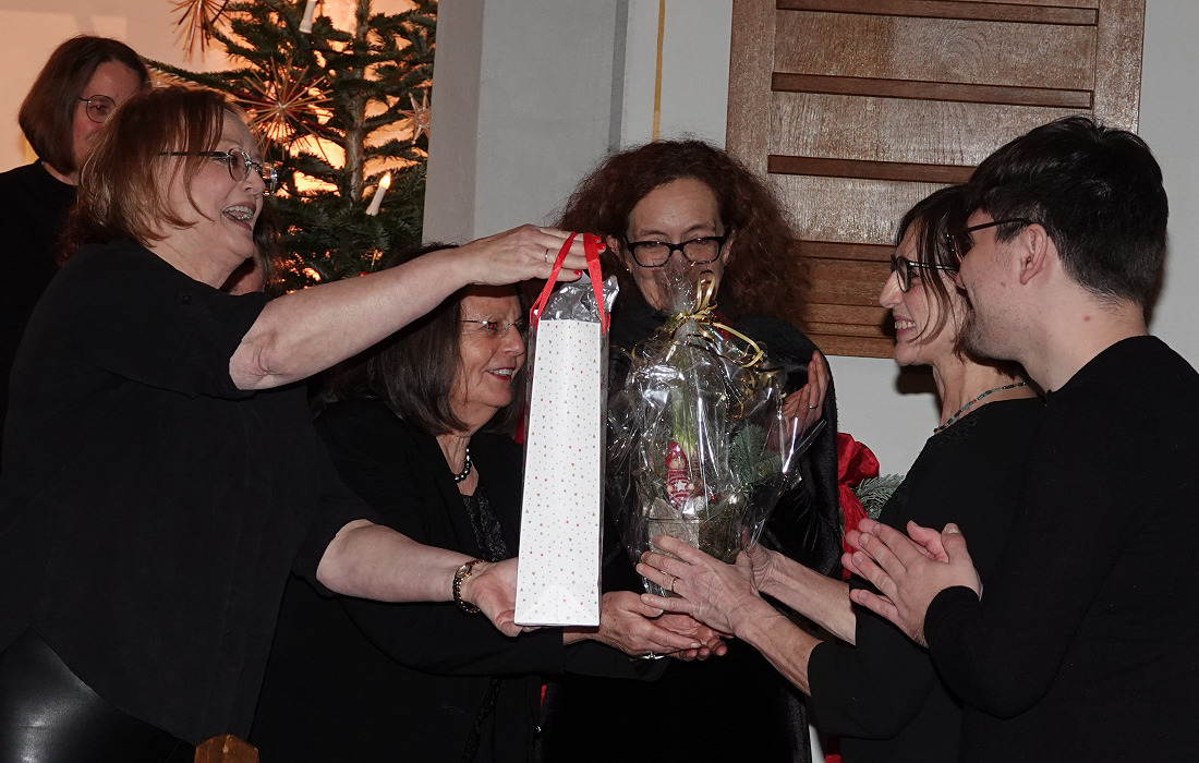 Dr. Renate Pollwein dankte im Namen des Frauenchors Andrea Stegmann und Till Otto mit einem Präsent. „Es hat großen Spaß gemacht“, freute sich der Birkenauer Kirchenmusiker, er begleitet die ChorYfeen seit einigen Jahre bei Konzerten.