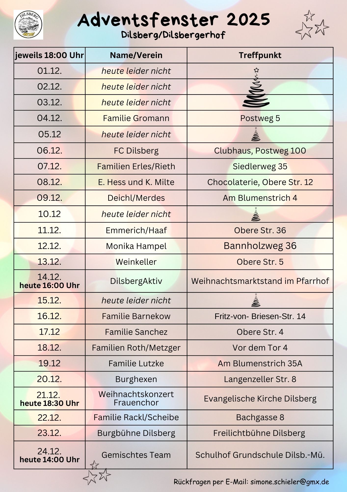 Die ersten Adventsfenster bei uns werden bald geöffnet. In der Übersicht unten finden Sie alle Termine und Treffpunkte für dieses Jahr. Herzliche Einladung dazu! Die Aktion wurde von einem kleinen Team von „Dilsberg aktiv“ ins Leben gerufen. Die Suche nach Gastgeberinnen und Gastgebern ist inzwischen abgeschlossen. Es sind nicht alle Termine besetzt, aber für das erste Mal ist es eine gute Resonanz! Für Zögerliche ist Gelegenheit, sich verschiedene Fenster anzuschauen und vielleicht ganz inspiriert im nächsten Jahr selbst eine Gastgeberrolle zu übernehmen. Geplant ist ein kurzes Beisammensein, das an jedem Treffpunkt unterschiedlich gestaltet wird. Dies wird, bis auf wenige Ausnahmen,  jeweils um 18:00 Uhr stattfinden. Fühlen Sie sich eingeladen, in der Adventszeit bewusst innezuhalten, miteinander ins Gespräch zu kommen, vielleicht neue Menschen kennenzulernen und Gemeinschaft zu pflegen. Das Adventsfenster-Team freut sich auf diesen besonderen Akzent beim gemeinsamen Weg durch die Adventszeit.