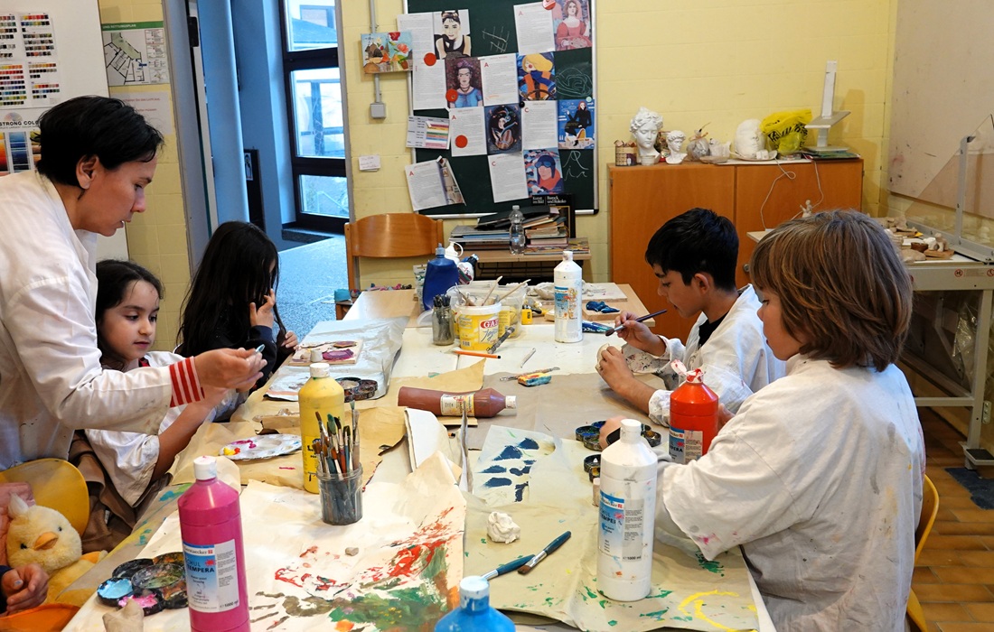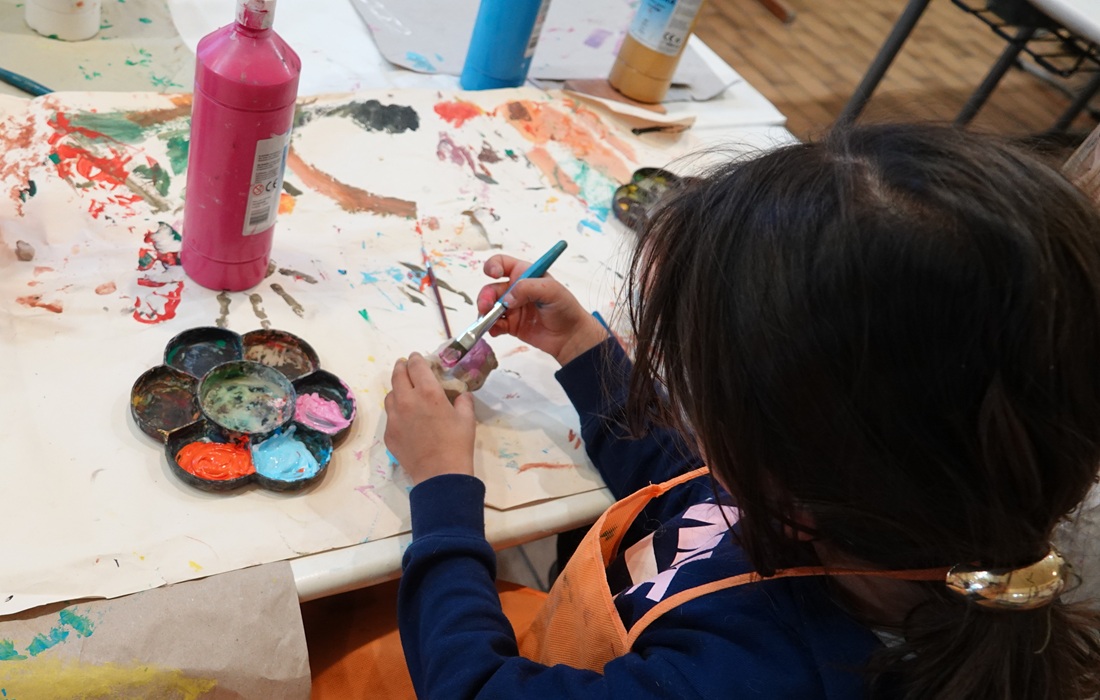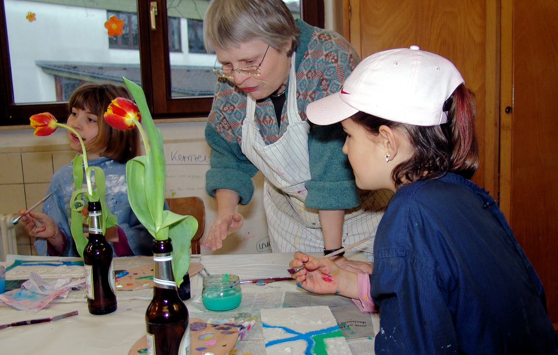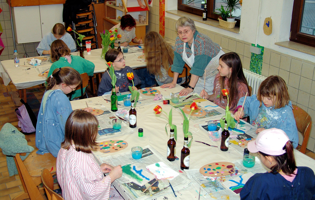 Gudrun Schilling und Lilli Marx gründeten die Malschule 1982. Dina Jetbayeva holt ein großes Album aus dem Nebenraum, in dem das Material gelagert wird. Es zeigt Fotos und Zeitungsausschnitte aus der Anfangszeit. Damals entstand mit dem Bau der Grundschule die Idee, Kindern früh Zugang zur Kunst zu ermöglichen. Über Jahrzehnte hinweg entwickelte sich daraus ein fester Bestandteil im Nachmittagsangebot der Schule. Ein Ort, an dem die Kinder mit unterschiedlichsten Materialien experimentieren können, begleitet von Kunstpädagoginnen.