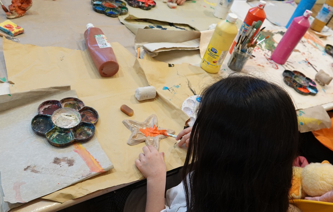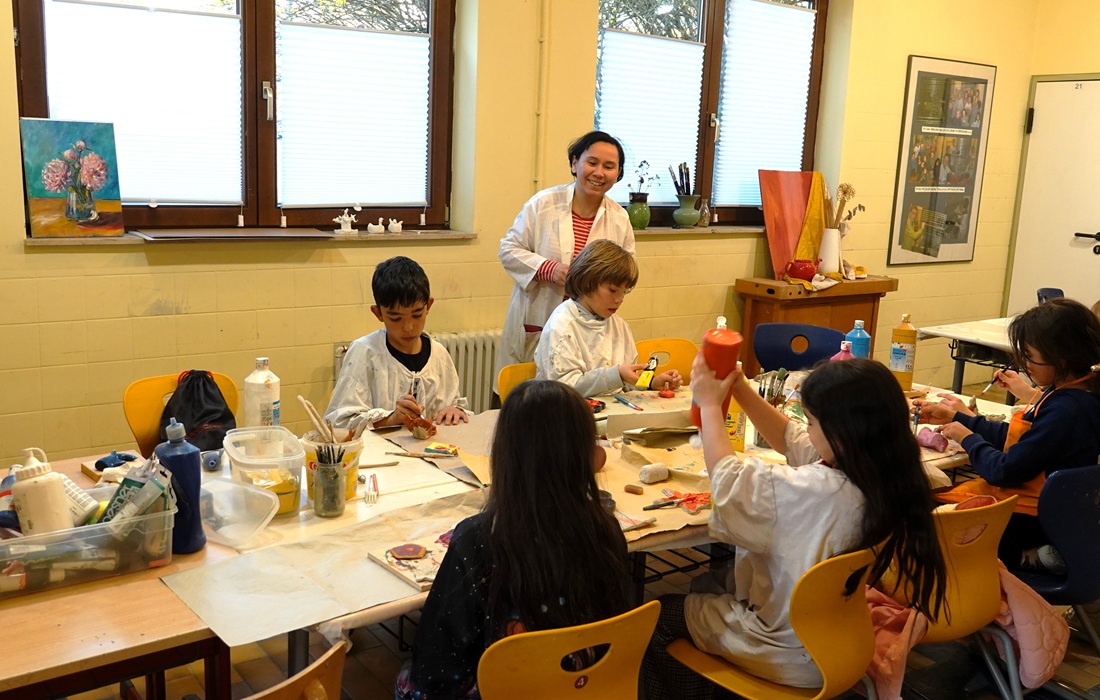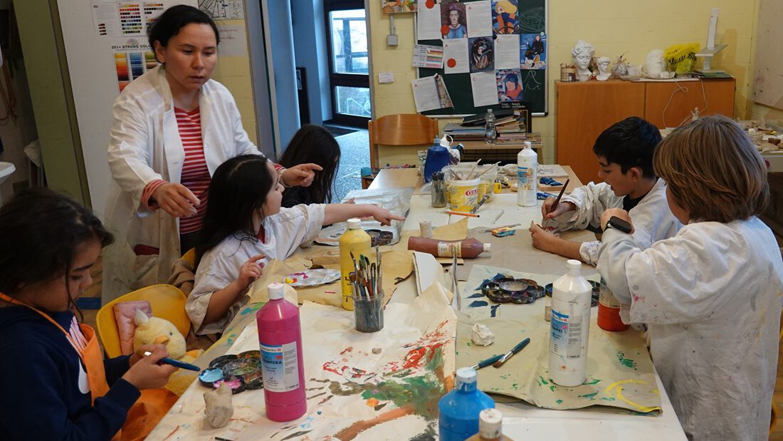 Es ist ein Mittwochnachmittag in der Grundschule Dilsberg-Mückenloch. Fünf Kinder sitzen um einen großen Tisch, Pinsel klappern in Wassergläsern, Farben mischen sich auf Paletten. Konzentriert bemalen die jungen Künstler ihre modellierten Figuren. Ella und Leo überlegen, welche Farben Seestern und Roboter bekommen sollen. Mittendrin: Dina Jetbayeva.