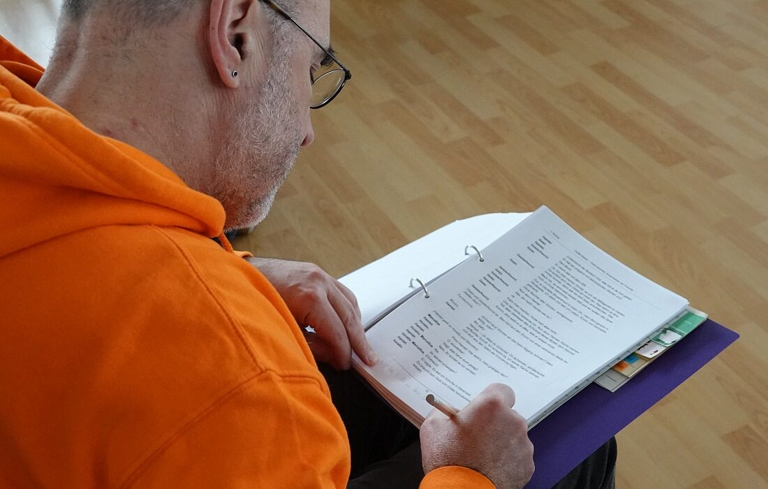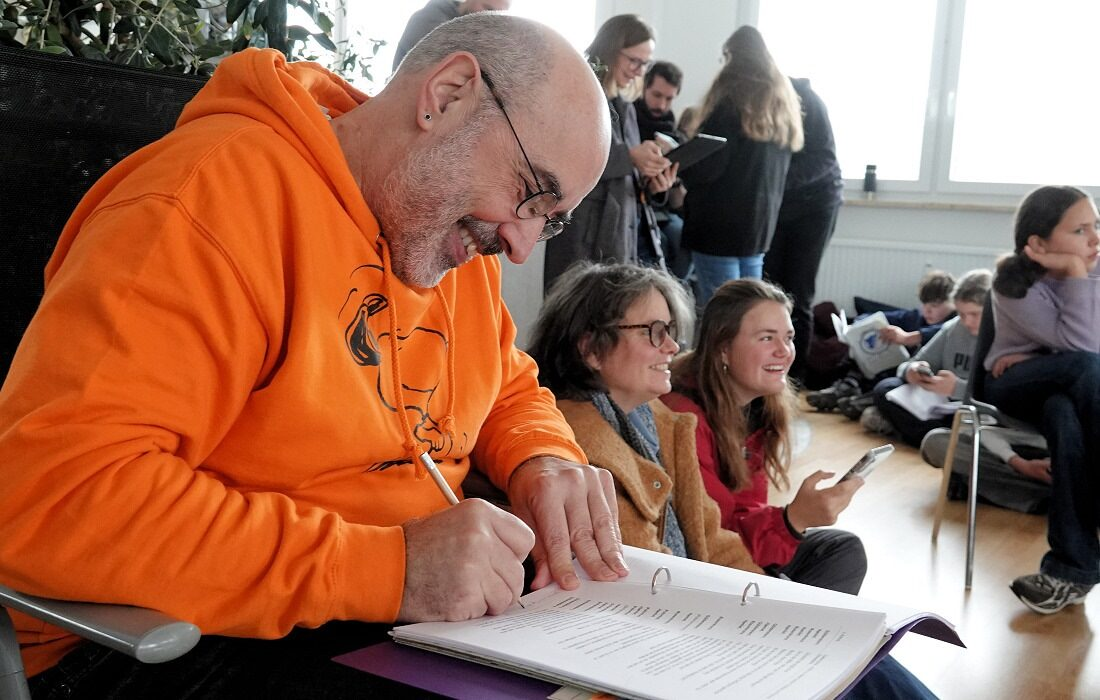 Über 60 Sprechrollen enthält das Stück. Falk-Jordan notierte Ideen und Versprecher: „Das bauen wir ein! “, rief er begeistert.