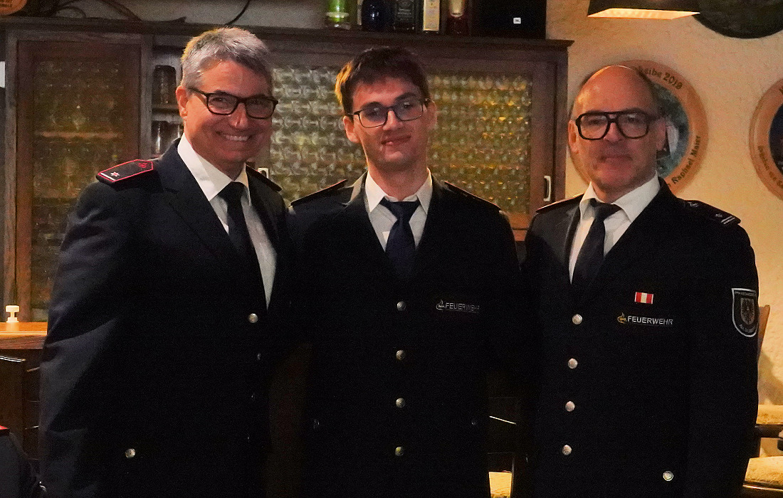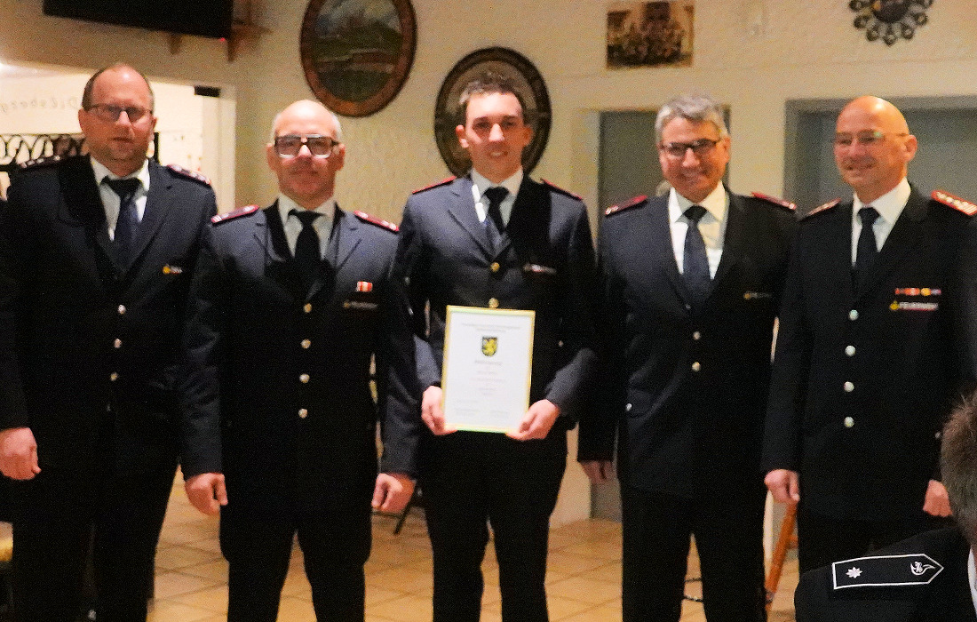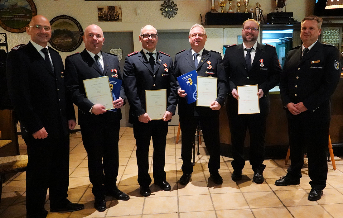 Bei den Ehrungen und Beförderungen wurden Felix Hillebrand, Tim Fischer, Maximilian Schäfer und Yannis Theocharidis zu Oberfeuerwehrmännern befördert. Jochen Schmidt erhielt eine Auszeichnung für 25 Jahre aktiven Dienst. Raphael Maier, Jürgen Seufert und Harald Theocharidis erhielten für 40 Jahre aktiven Feuerwehrdienst das Feuerwehr-Ehrenzeichen in Gold sowie die Verleihungsurkunde des baden-württembergischen Innenministers Thomas Strobl. „40 Jahre, das muss man sich mal vorstellen!“, lobte Güll. Die Bereitschaft, Tag und Nacht einsatzbereit zu sein, verdiene höchsten Respekt. Kommandant Theocharidis wurde zudem zum Oberbrandmeister befördert.