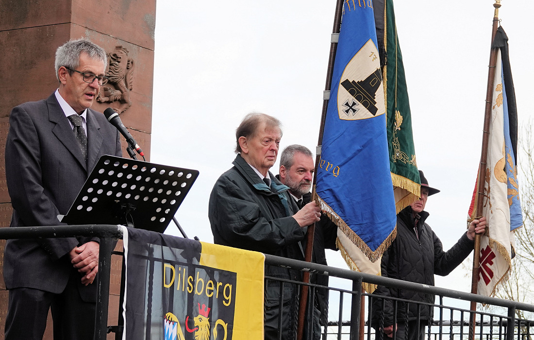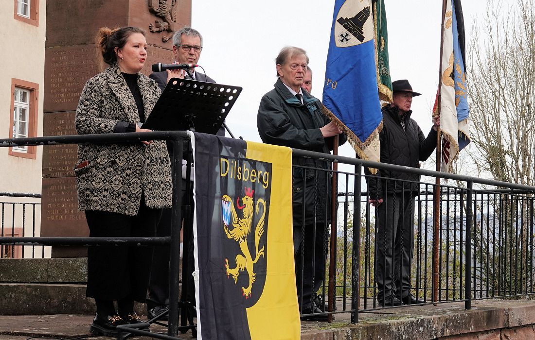 Ortsvorsteher Andreas Erles erinnerte in seiner Ansprache an die Geschichte Dilsbergs. Die Mauern der Burg hätten Schutz geboten, jedoch auch Zerstörung erlebt, sagte er. Hinter den vielen Namen auf den Tafeln des Ehrenmals stünden junge Männer aus dem Ort – Menschen mit Hoffnungen und Zukunftsplänen, deren Leben der Krieg ausgelöscht habe. Viele Familien hätten mehrere Angehörige verloren, andere seien heimgekehrt, aber für immer gezeichnet geblieben.
