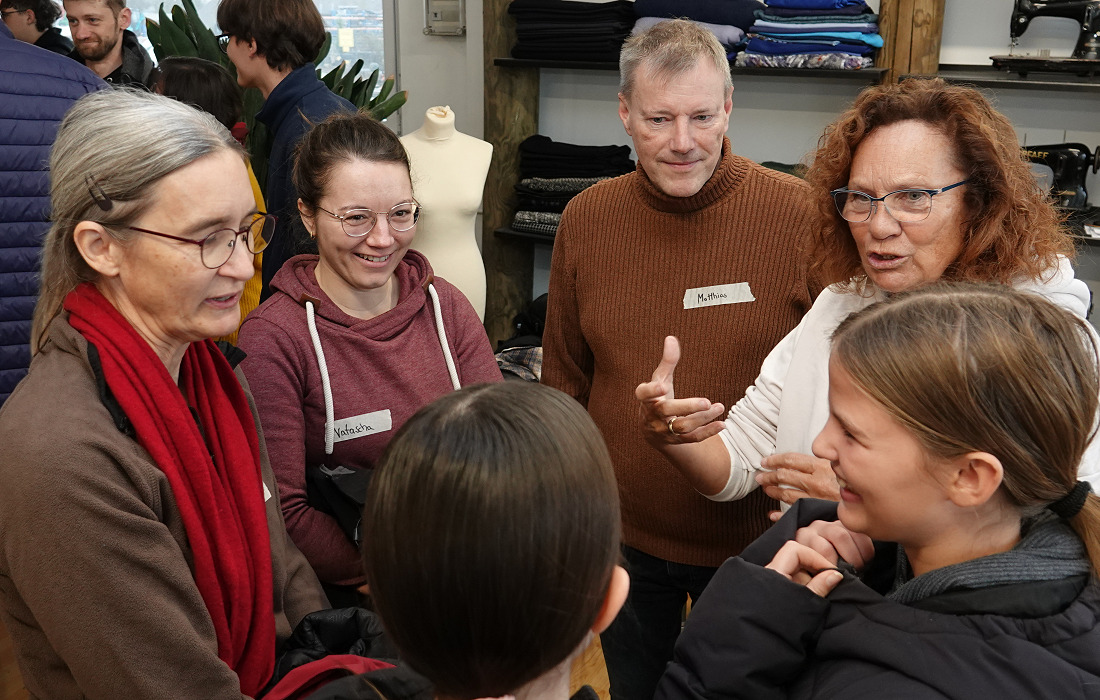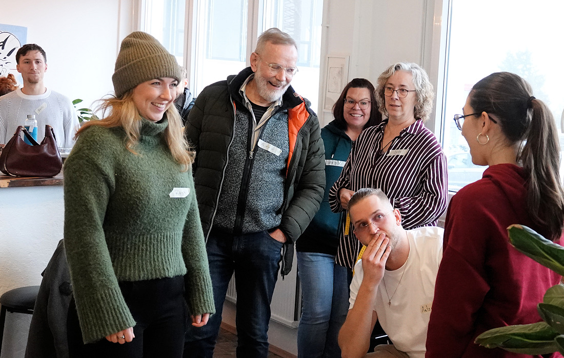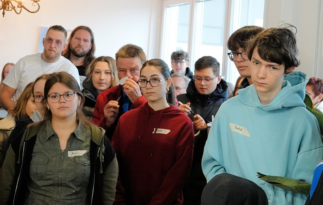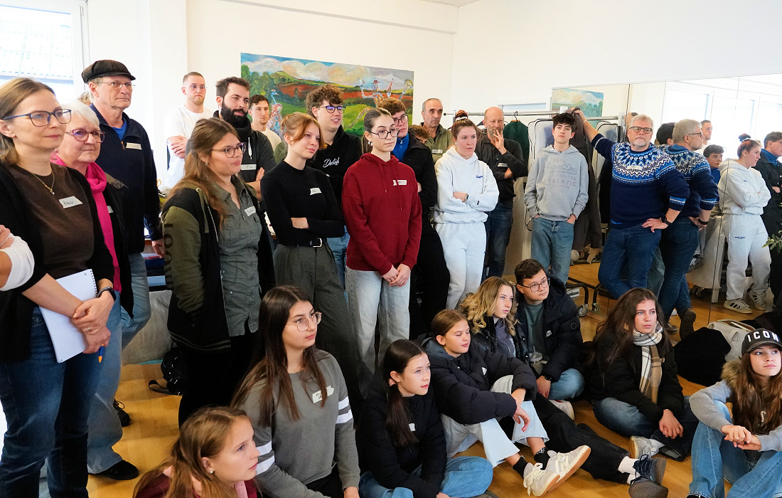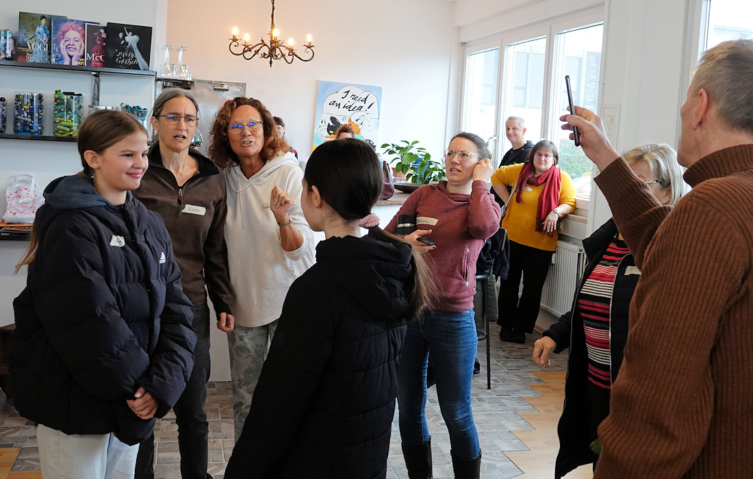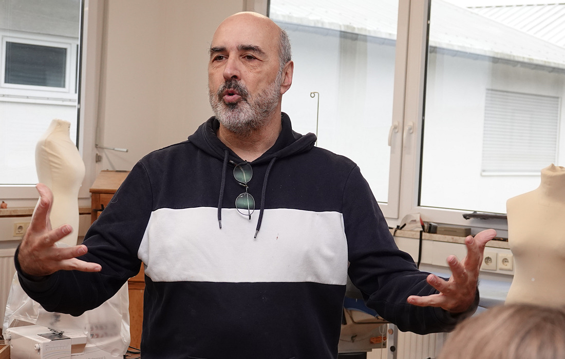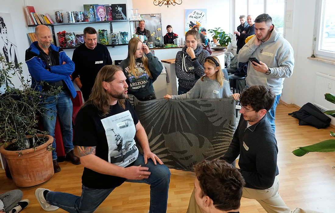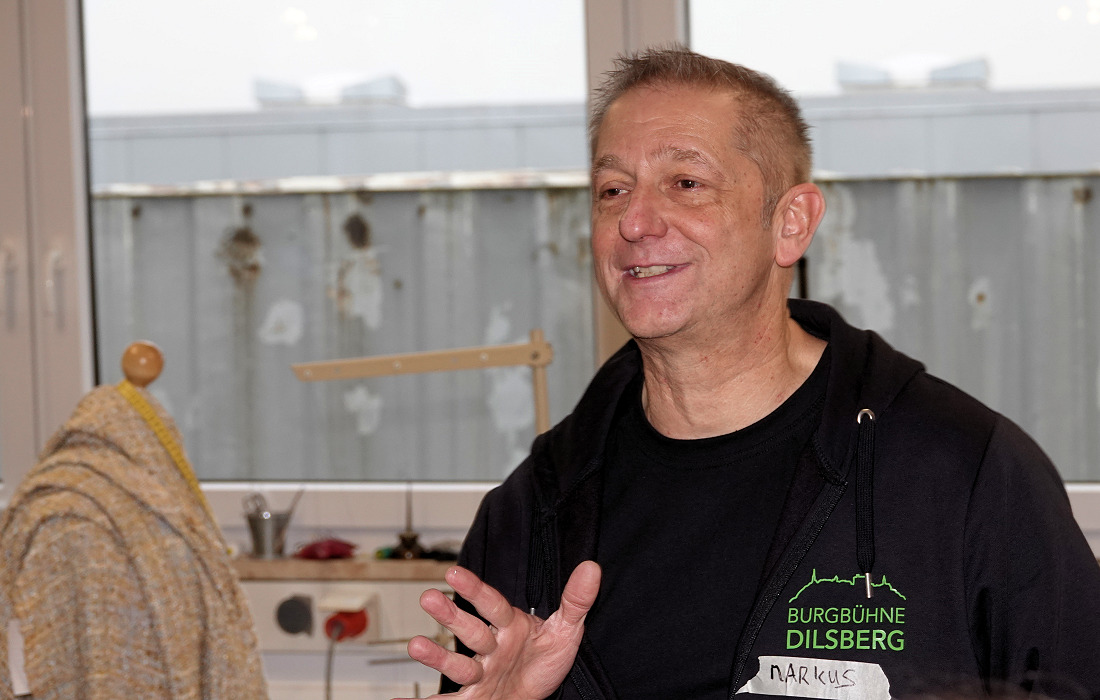 In kleinen Teams zu sechst entwickelten die Teilnehmenden Szenen, wie sie in einer möglichen Inszenierung vorkommen könnten. Viele dieser spontanen Ideen nahm er sofort auf. „Ihr spielt im gehobenen Amateurbereich“, lobte er. „Ich bin begeistert.“