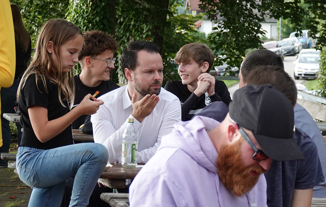 Am Mittag begann der offizielle Teil: Maximilian Bernauer, erster Stellvertreter des Bürgermeisters, und Thomas Ruf, er vertrat Ortsvorsteher Andreas Erles, eröffneten die Veranstaltung von der Terrasse aus. „Ich bin immer wieder beeindruckt, was der Verein auf die Beine stellt“, sagte Ruf. „Sport verbindet, bringt Menschen zusammen, egal wie alt sie sind.“ Ralf Schönfeld, erster Vorstand des Fördervereins, ehrte Gerhard Schilling für seine jahrzehntelange Unterstützung im Förderverein. Sichtlich gerührt nahm Schilling die Ernennung zum Ehrenvorsitzenden entgegen. „Wir sind mächtig stolz, dass du uns mit Rat und Tat zur Seite stehst.“, dankte Ralf Schönfeld. Jürgen Kochan, der an dem Tag nicht dabei sein konnte, erhält ebenfalls die Ehrung.