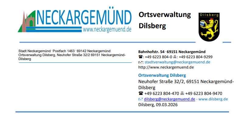 in der Zeit vom 18.03.2026 bis zum 30.03.2026 können in der Ortsverwaltung Dilsberg aufgrund Urlaub nur eingeschränkt Leistungen angeboten werden.