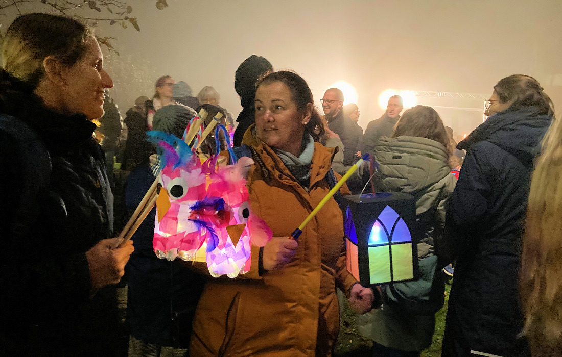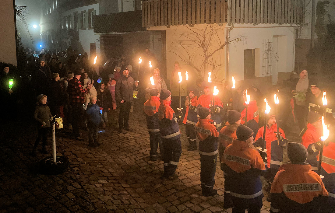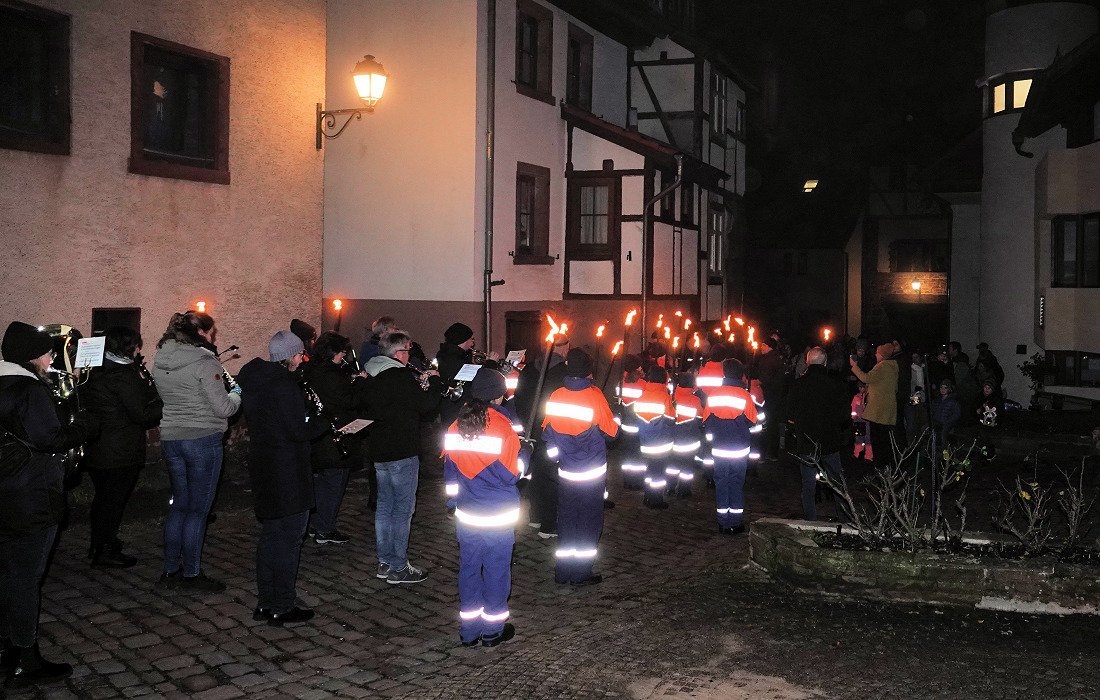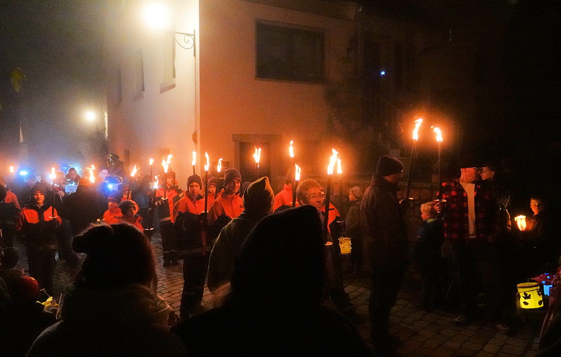 Gefolgt von einer langen Lichterkette aus bunten Laternen – getragen von Kindern, Eltern und Großeltern. Begleitet wurde der Martinsumzug von der Feuerwehr Abt. Dilsberg. Ihr Fackelmeer schenkte Licht und sicherte den Umzug.