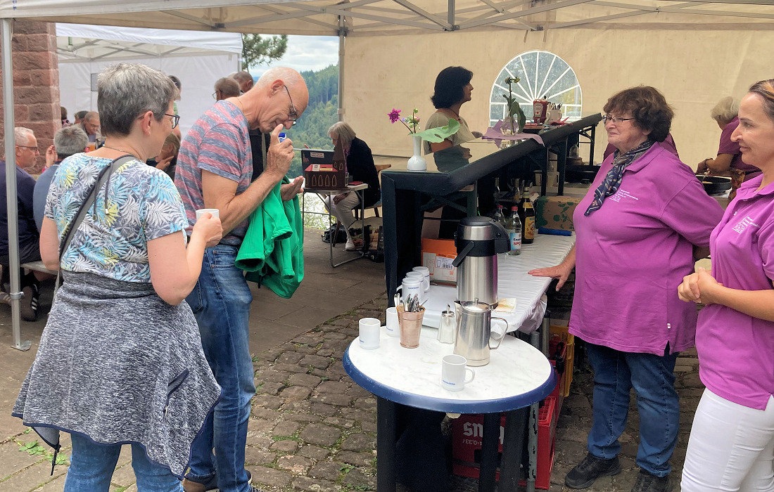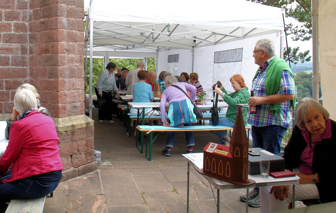 Es war der letzte Kirchencafé-Sonntag des Jahres in Dilsberg. Nach dem Gottesdienst am vorletzten Septemberwochenende lud der Förderverein der evangelischen Kirche auf die Terrasse ein. Der Himmel war grau, doch es blieb trocken. Vorsichtshalber hatte man die Zeltwände geschlossen – der Blick ins Tal blieb dennoch frei: Ein paar Schritte zur Treppe oder Theke, und das Panorama öffnete sich.