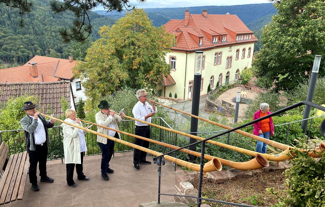 Um 14 Uhr legte sich plötzlich Musik über die Terrasse: Vom Rosenplatz herauf erklangen Alphörner. Die „Kurpfälzer Alphornbläser“ – Rudolf und Ute Siebert, Werner Wolf und Günter Keller kündigten sich mit Schweizer Chorälen an. Gerade mal dreieinhalb Kilogramm wiegt ein Horn, doch der Platzbedarf beim Spielen erfordert oft Kreativität. Auf der mittleren Terrasse des Kirchenaufgangs formierten sich die vier Musiker und gaben ein weiteres Ständchen.