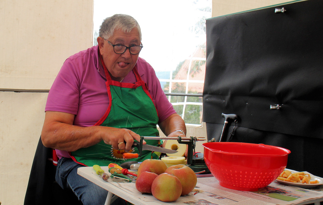Besonders begehrt waren die Apfelküchlein. Bernhard Hoffmann schälte und schnitt die Früchte, seine Frau Gabi tunkte sie in den Teig und legte sie ins heiße Fett. Der Duft zog über die Terrasse, und die Gäste griffen zu.