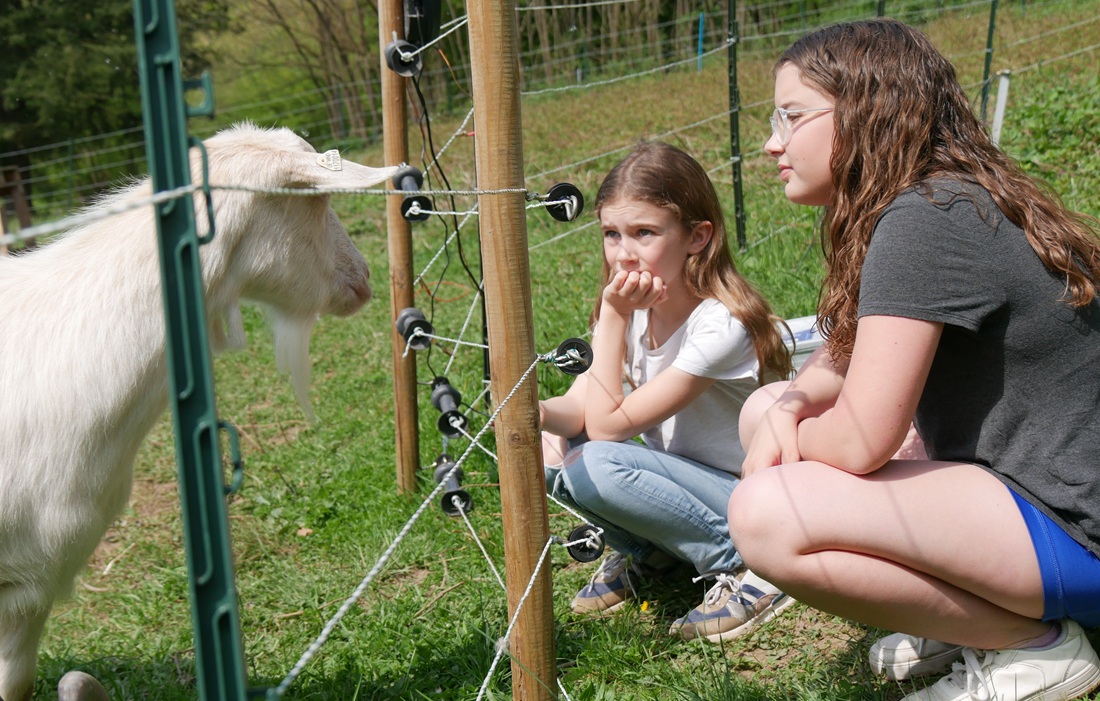 Die Besucher:innen konnten sich davon überzeugen, dass der Lebenshof mehr ist als ein Refugium für Tiere: Auf rund fünf Hektar Fläche pflegen die Schafe und die drei Brombeerhecken liebenden Ziegen die Landschaft zwischen Bus Mayer und dem städtischen Allmend – ganz ohne Maschinen, dafür aber zu 100 Prozent umweltfreundlich, leise und sanft. Schafe fressen das Gras kurz, düngen den Boden gleichzeitig durch ihren Kot und fördern damit die Biodiversität, indem sie Samen in ihrem Fell verbreiten. Sie sind die perfekten ökologischen Rassenmäher. „Die Tiere leisten einen wertvollen Beitrag zum Erhalt der Kulturlandschaft“, erklärt Diana Mayer. „Gleichzeitig schaffen wir so Lebensraum für viele andere Arten.“