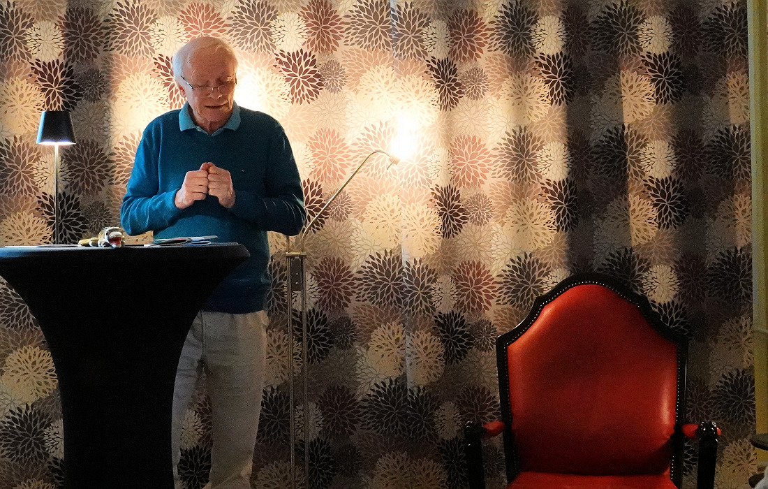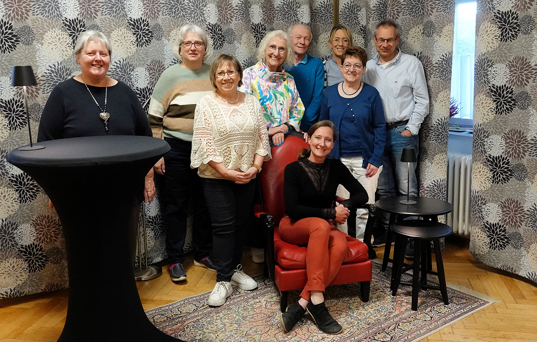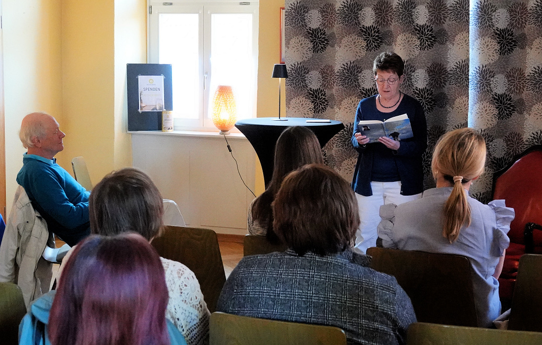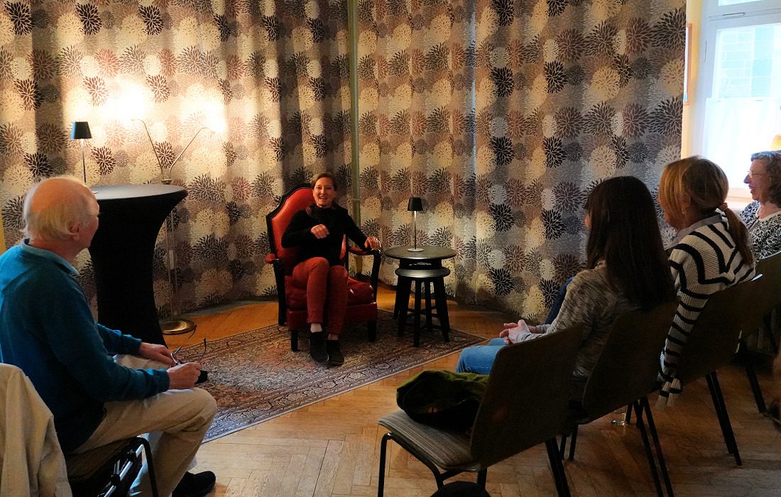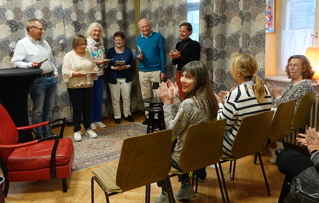 Fünf Autorinnen und Autoren der Gruppe „LeseZeit“ gestalteten den Abend. Das Publikum nahm in dem liebevoll hergerichteten Raum Platz, dessen Mittelpunkt ein großer roter Lesesessel auf der kleinen Bühne bildete und für eine stimmungsvolle Atmosphäre sorgte.