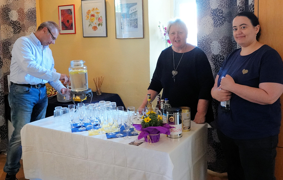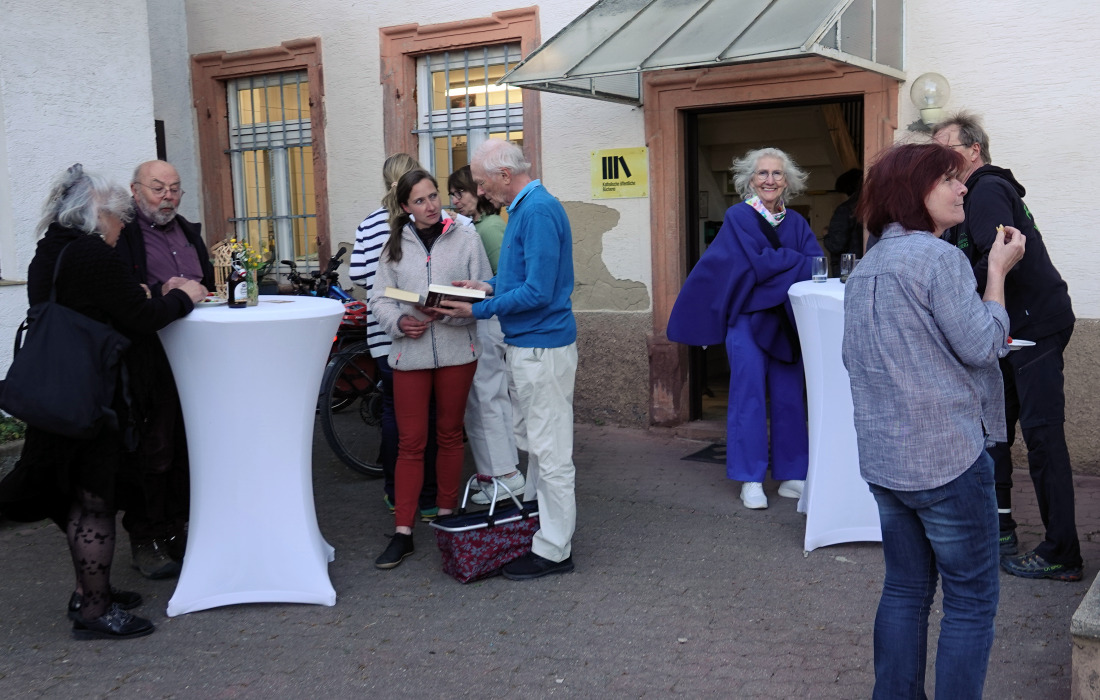 In der Pause gab es Snacks und Getränke, die das Team der KÖB vorbereitet hatte. Drinnen und auch im Pfarrhof plauderten die Gäste, kamen mit den Autoren ins Gespräch und erwarben die ein oder andere Ausgabe, die die Autoren auf einem Tisch ausgebreitet hatten.
