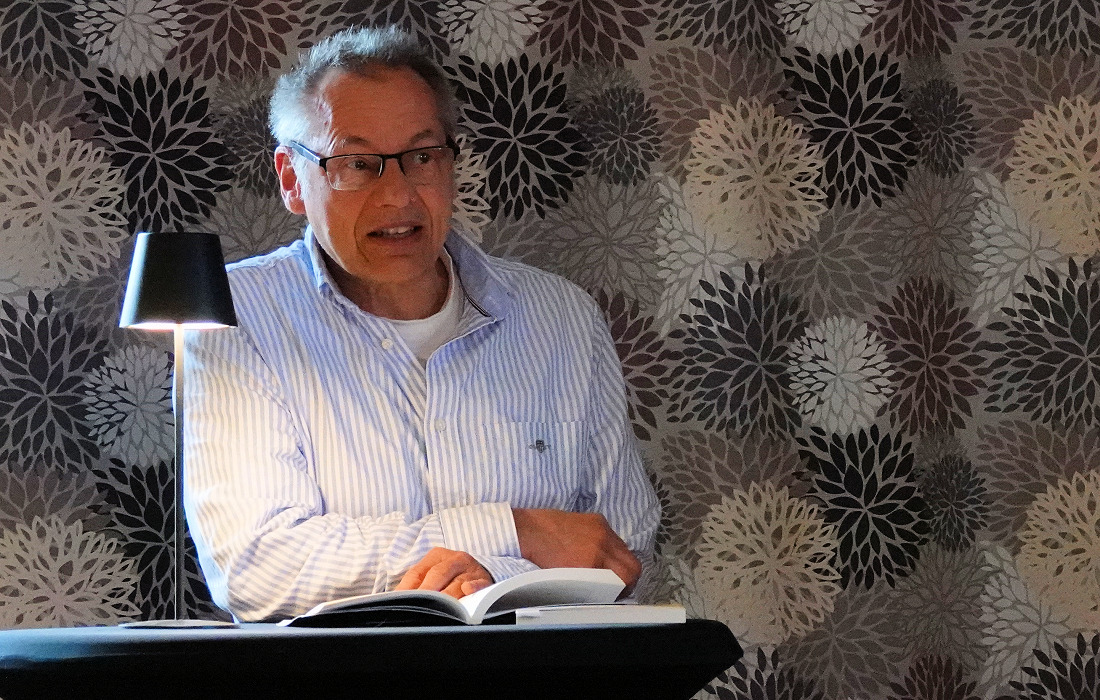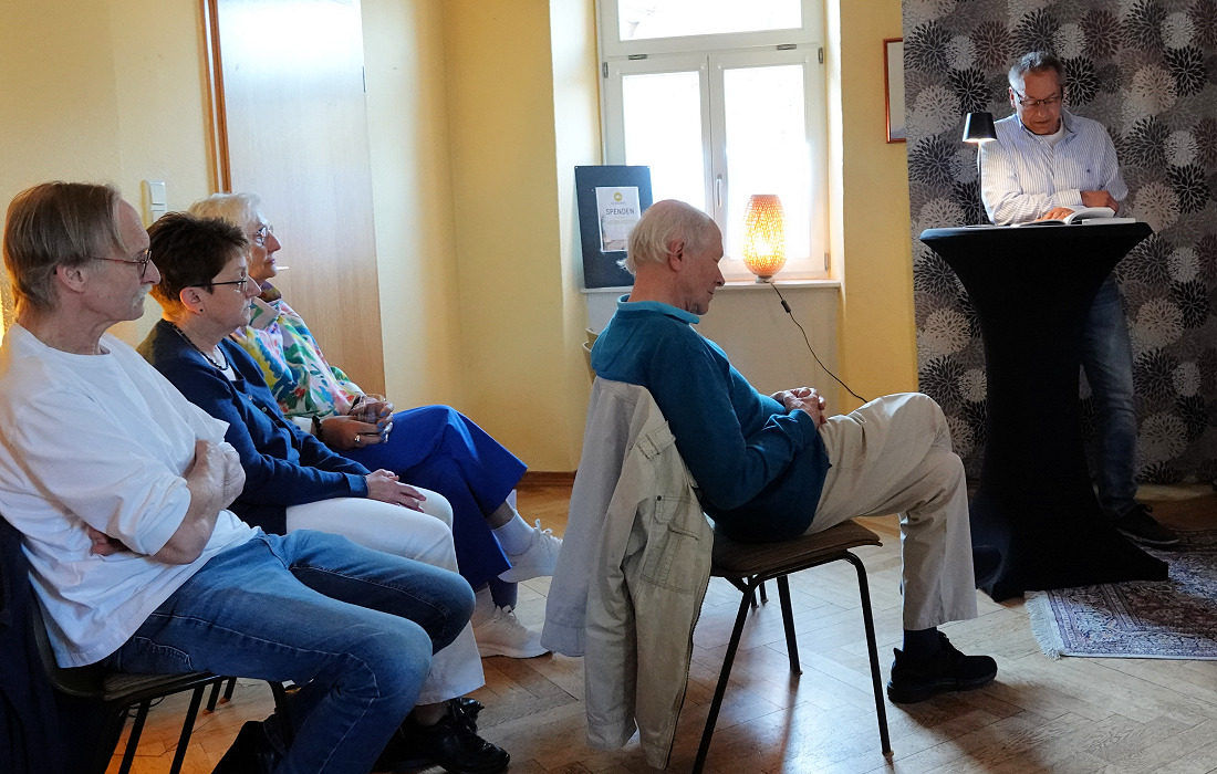 Erik Hauser las aus seiner Kurzgeschichte „Die Abstellkammer“, die 2021 für den Heidelberger Autorenpreis nominiert war. Seine detailreichen Beschreibungen eines überfüllten Abstellraums trafen ins Schwarze. Viele Gäste erkannten ähnliche Zustände bei sich zu Hause wieder. Als die Hauptfigur Bertram schließlich durch ein Missgeschick eingeschlossen wird, während die Familie verreist, ist das Chaos perfekt. Das Publikum brach in herzhaftes Lachen aus. „Super! “, rief eine Zuhörerin spontan.