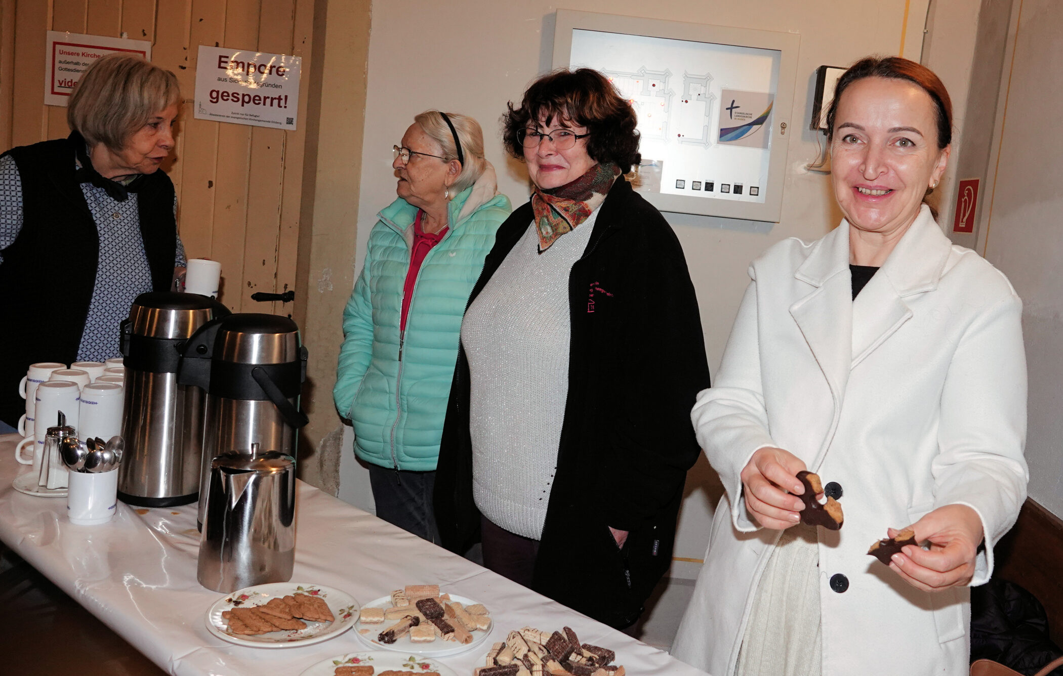 In einer Schlange stellten sich die wahlberechtigten Gemeindeglieder auf, um ihre Stimme zur Wahl des Ältestenkreises abzugeben. Als kleine Belohnung wurde ihnen noch Kaffee und weihnachtliches Gebäck gereicht, vor- und zubereitet vom Förderverein der Evangelischen Kirche in Dilsberg.