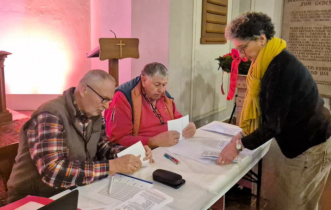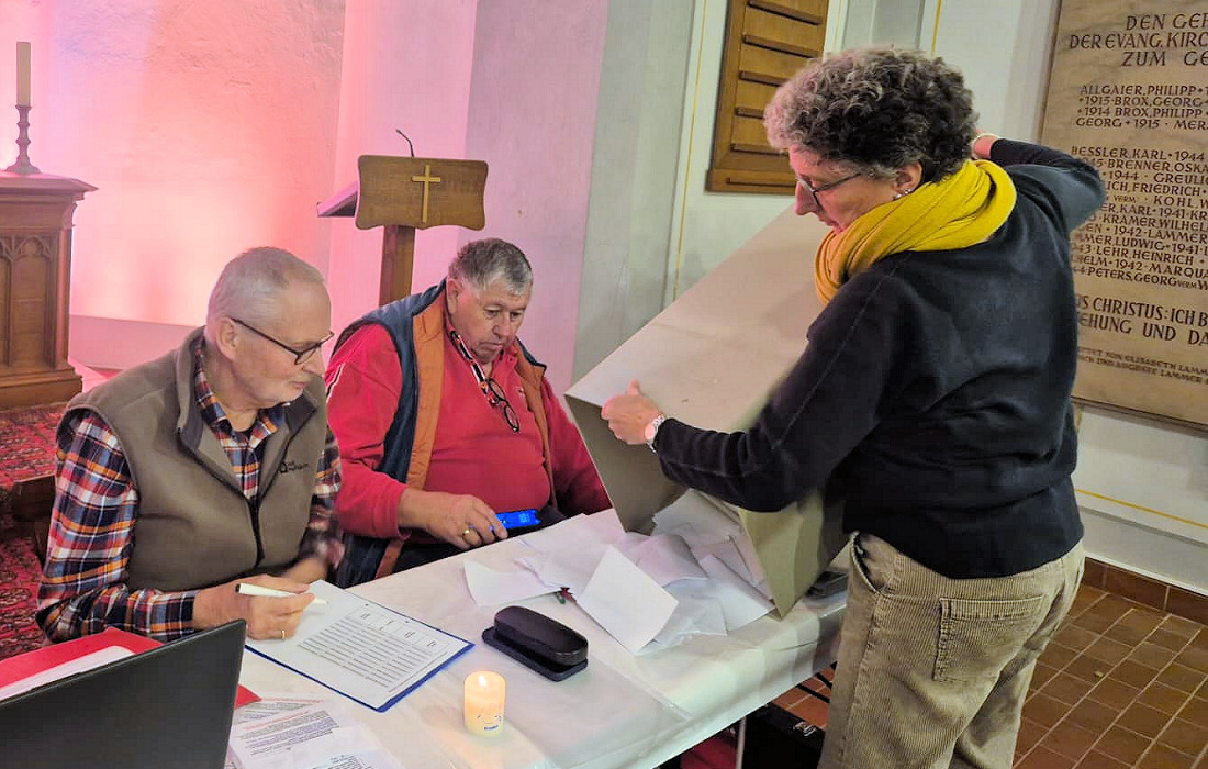 Ab 15 Uhr zählte der Wahlausschuss, die abgegebenen Stimmen aus. Diesem gehörten neben dem Vorsitzenden die amtierenden Ältesten Martin Oemler und Annette Mauerer an.
