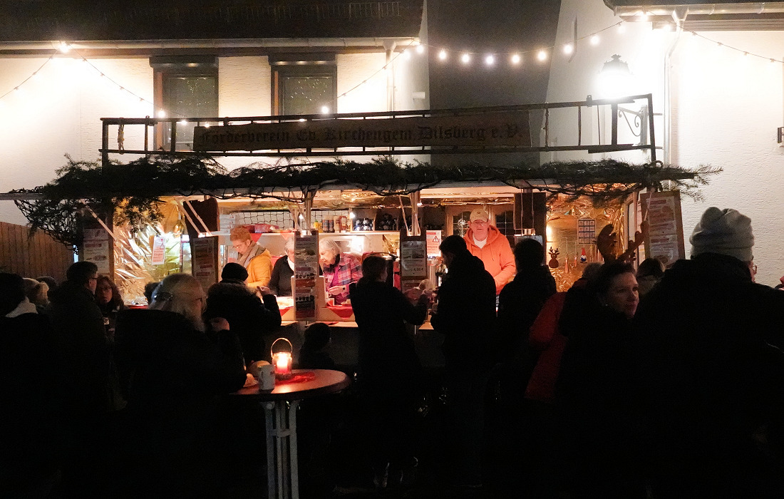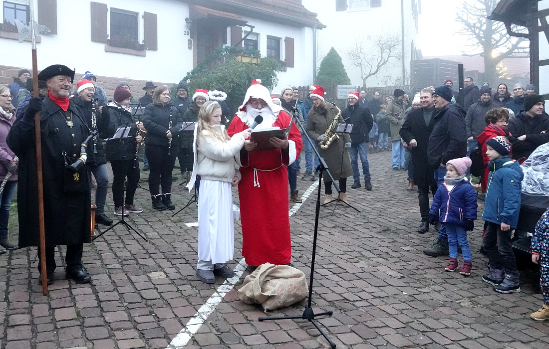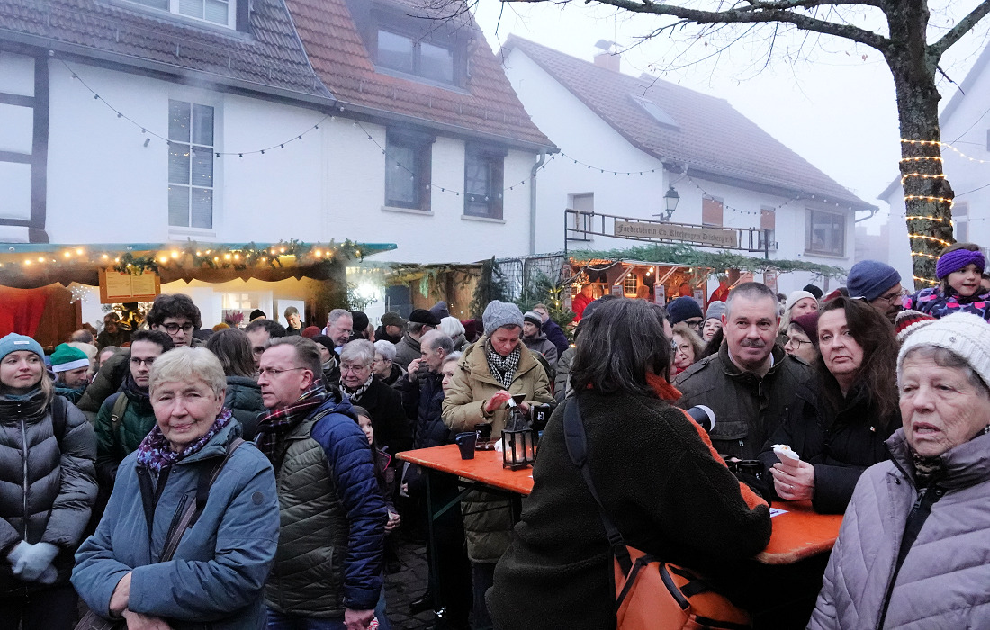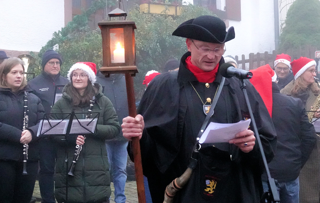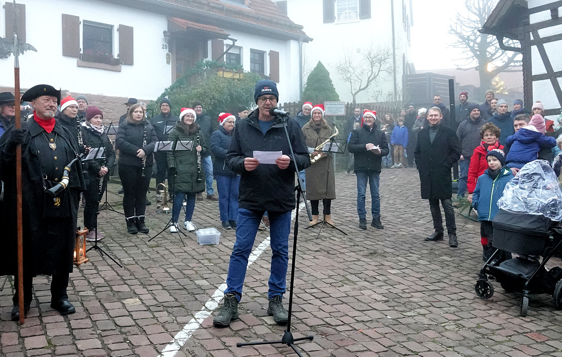 Zur Eröffnung versammelten sich Dilsberger und Besucher dicht aneinander auf dem Dorfplatz. Kräftige Töne aus dem Nachtwächter-Horn ließen aufhorchen. „Hört, ihr Leut’, und lasst euch sagen, die Glock’, die hat vier geschlagen!“, sang Raphael Maier, und die Nachtwächter stimmten ein. Hajo Hoffmann wünschte im Namen der Nachtwächter frohe Festtage und erinnerte daran, auch an alte und kranke Menschen zu denken.