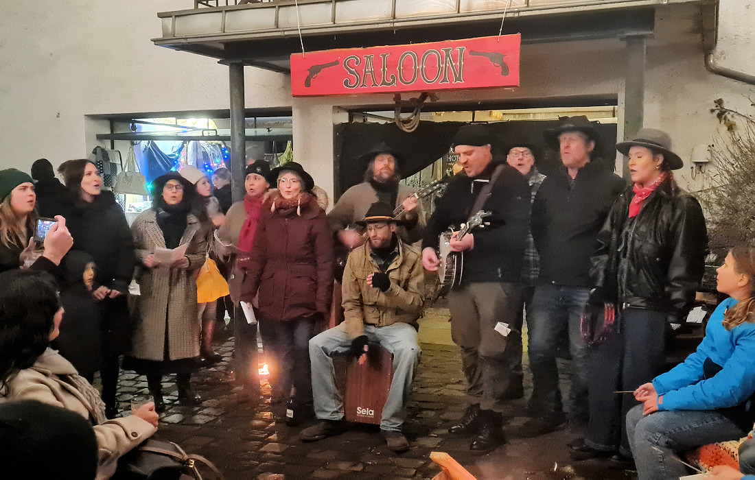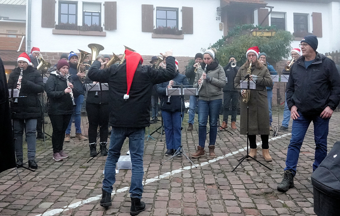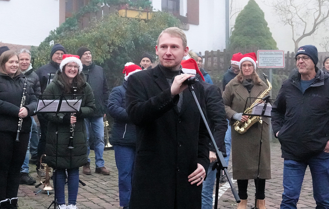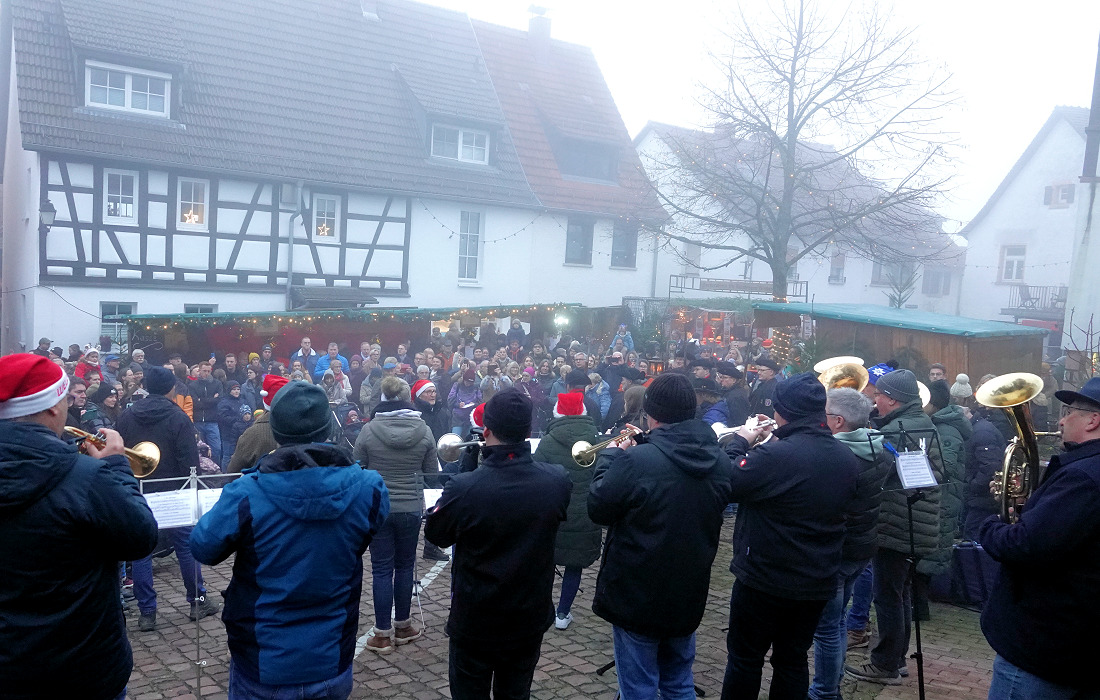 Der Musikverein unter Walter Nußkos Leitung spielte unter anderem „Herbei, o ihr Gläubigen“ und „Tochter Zion“. Dicht standen die Zuschauer beisammen und stimmten spätestens bei „Oh, du fröhliche“ ein.